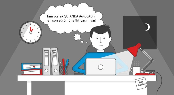 Dan, bir projeyi teslim tarihine yetiştirebilmek için geç saatlere kadar çalışıyor. Tam olarak ŞU ANDA AutoCAD'in en son sürümüne ihtiyacı var.